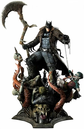 Prime 1 Studio hat einen Batman in seiner gefährlichsten Form geschaffen! Mit einer beeindruckenden Größe von 41 Zoll hat er jeden Anschein von Subtilität abgelegt! Batman hat sich in einen schäbigen, fledermausähnlichen Ledermantel mit überdimensionalen Schulterstacheln, massive Metallarmschienen mit rasiermesserscharfen Flossen und einen Industriegürtel gekleidet, der mit den am härtesten aussehenden Stiefeln verbunden ist, die einem den Hintern versohlen! In den Büchern verleiht sein Trenchcoat Batman die Fähigkeit, sich vor Entdeckung zu schützen. Der Dunkle Ritter hat es auf sich genommen, ein post-apokalyptischer Sensenmann zu werden, indem er eine riesige Sense als seine Signaturwaffe benutzt! Vor allem aber ist er im Besitz eines mächtigen Rings der Schwarzen Laterne, der es ihm ermöglicht, über einen unerschöpflichen Vorrat an wiederbelebten Leichen zu verfügen: seine Untotenarmee!