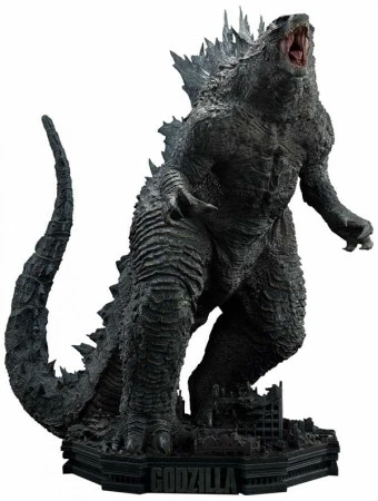 Godzilla steht auf einem Sockel aus Polystone, der eine zum Film passende, mit Schutt übersäte Stadtruine darstellt, die von seinem donnernden Auftritt sichtlich erschüttert ist.