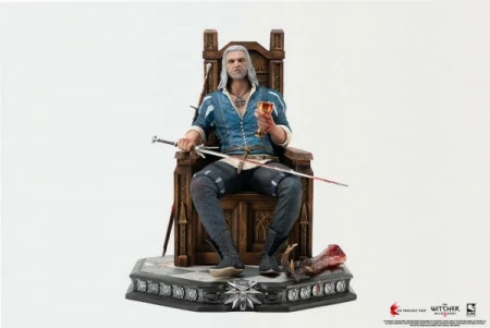 PureArts ist stolz darauf, das atemberaubende Cover von Blood & Wine zum Leben zu erwecken, das Geralt von Rivia zeigt, wie er von seinem Thron aus einen blutigen Kelch in der einen und sein verbessertes silbernes Greifenschwert in der anderen Hand hält, während der abgetrennte Arm des Hochvampirs Dettlaff zu seinen Füßen liegt.